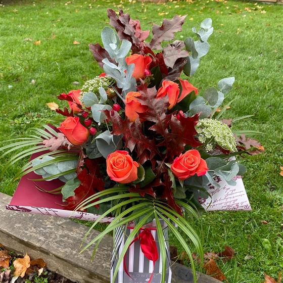 Stunning orange roses, hypericum berries greens to finish ( oakleaves will be used when they are available )