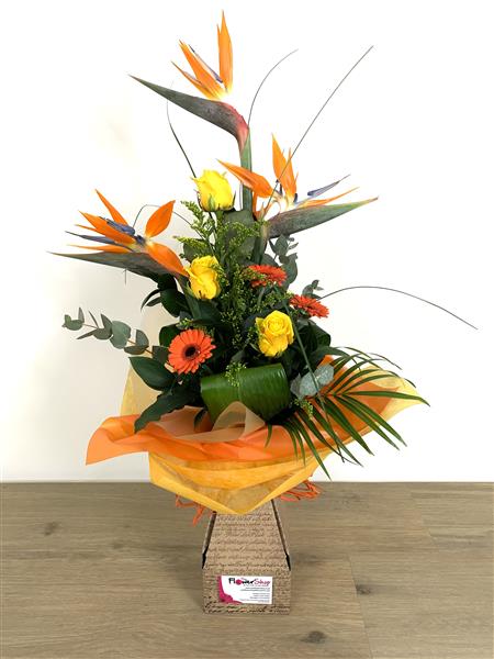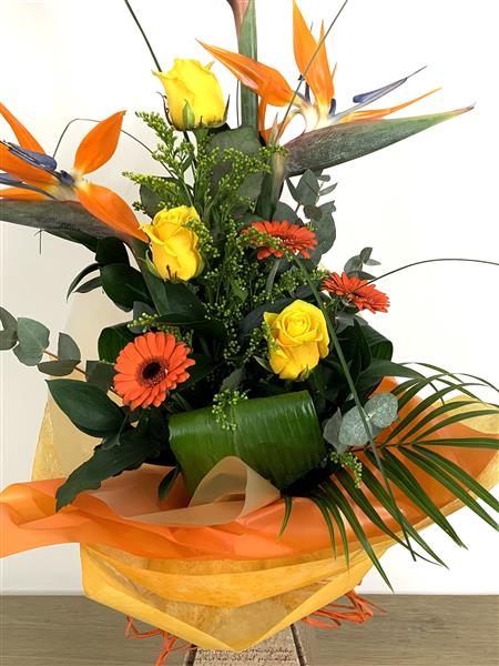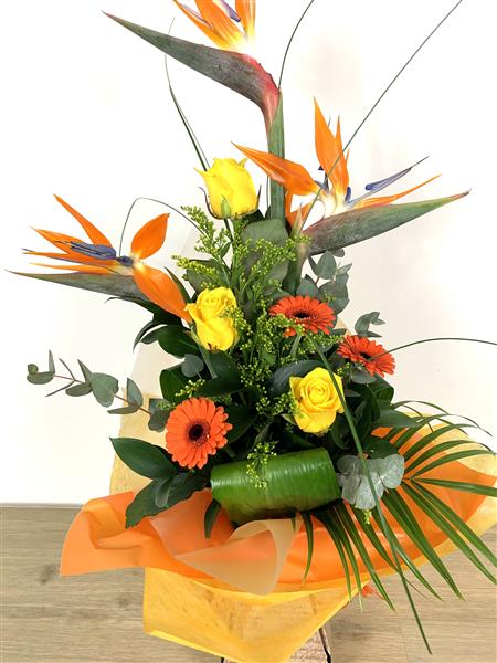 Colour and texture are the name of the game for this vase arrangement. birds of paradise, gerbera ,yellow roses, gerbera and solidaster .