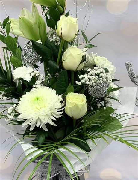 A brilliant selection of white and green flowers carefully selected and designed by our trained florist delivered in water for instance presentation