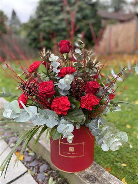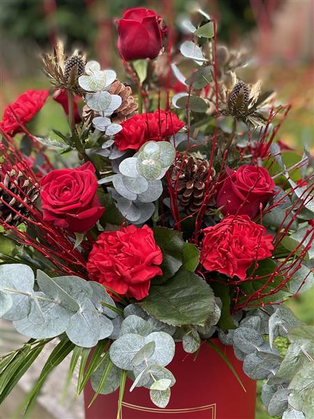 A stunning hat box full of seasonal flowers and Christmas sparkle