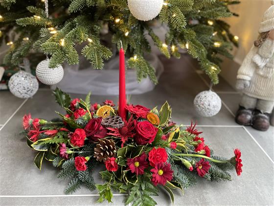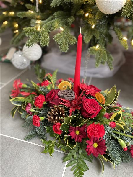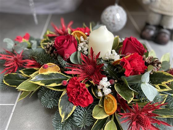 A beautiful Christmas candle arrangement, in reds and gold season flowers.