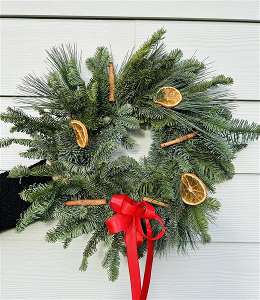 Memorial wreath will come with a red bow cinnamon sticks and orange slices on.