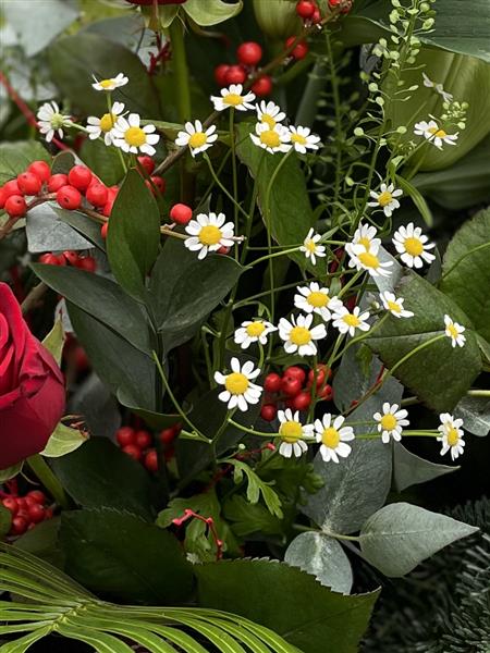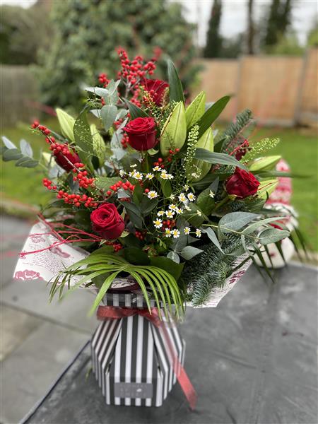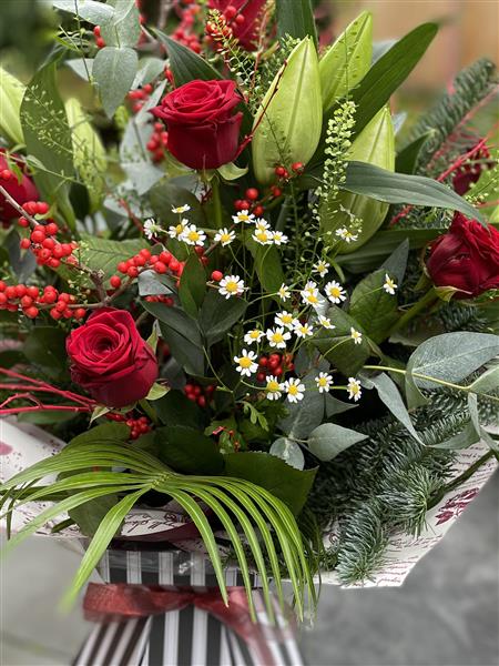 An beautiful display of highly fragrance white lilies and fabulous red roses mingled with a variety of foliage and berries.