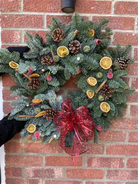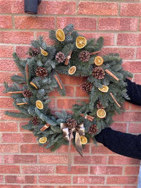 Make a real impression this year with a traditional Christmas Door Wreath. Beautifully crafted with, blue spruce Pine Cones cinnamon sticks and complete with dried orange slices for a classic Yuletide welcome home.