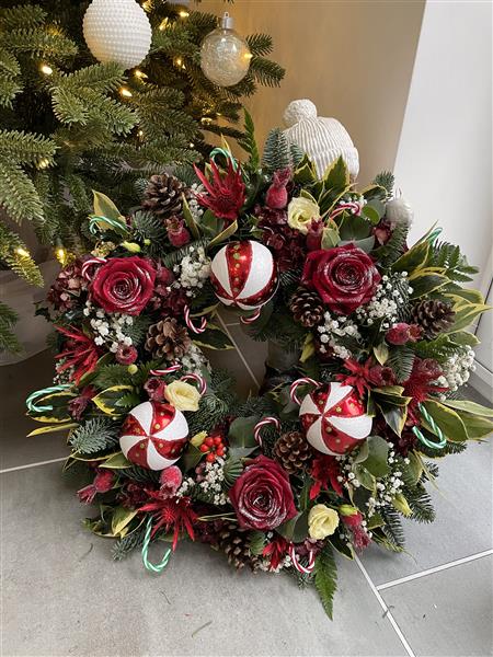 An amazing wreath with the most stunning Red roses candy canes berries holly blue spruce and other festive bits.