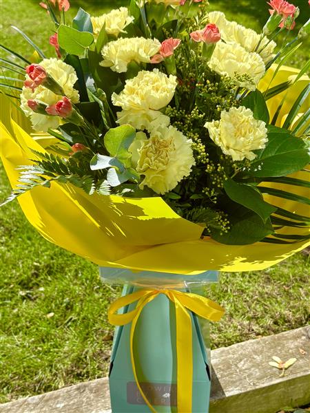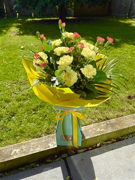 Consist of yellow carnations, orange spray carnations and solidaster finished with lovely greenery.