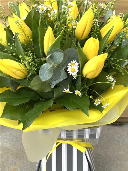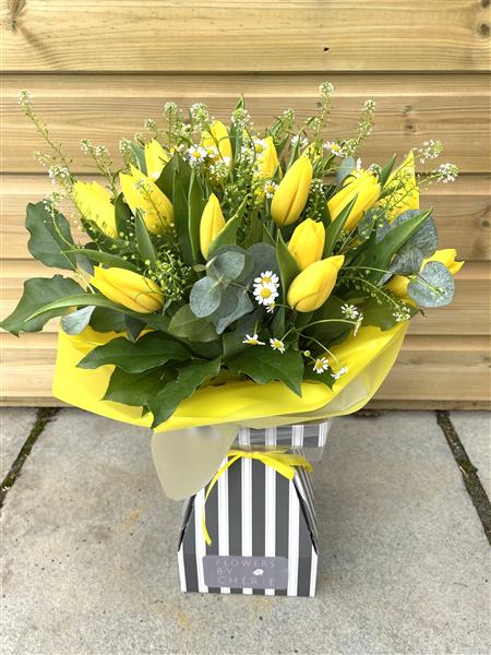 What’s not to love! yellow tulips , thalyspia and Camille a stunning combination that would brighten anyone's day.
