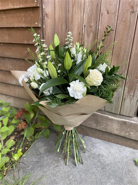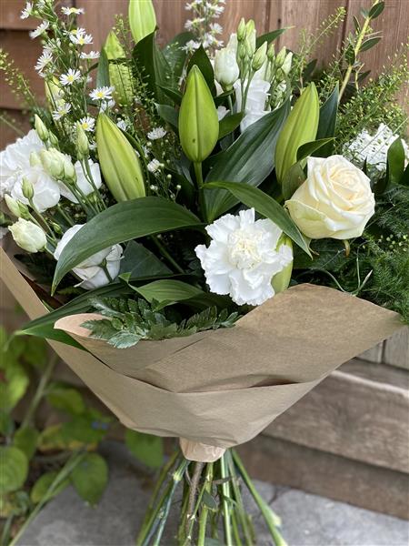All white eco bouquet. A brilliant white selection of white and greens wrapped in eco