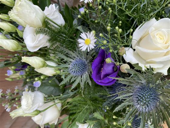 A fantastic selection of purple and white seasonal flowers.