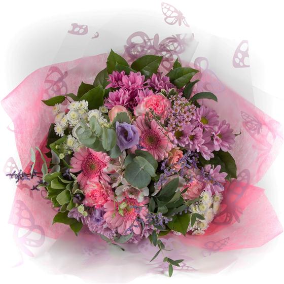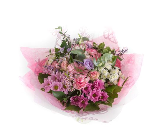 A simple hand-tied bunch of pink and lilac blooms including gerberas, chrysanthemums, carnations and alstromeria.