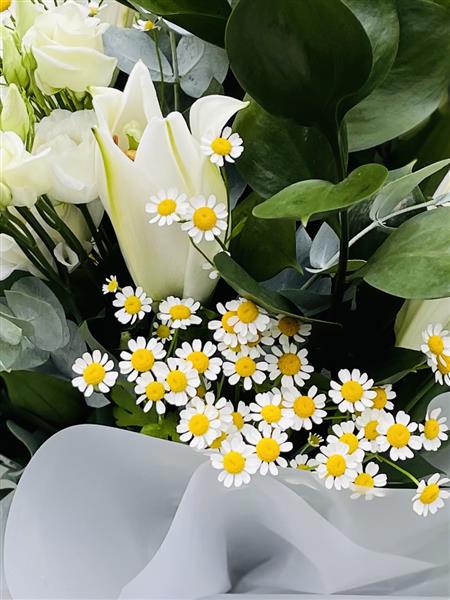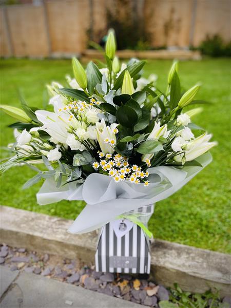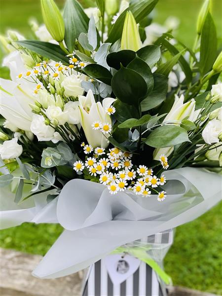 The purest of white lily lovely white lisianthus and filler flower and luscious greens to make a show stopper!