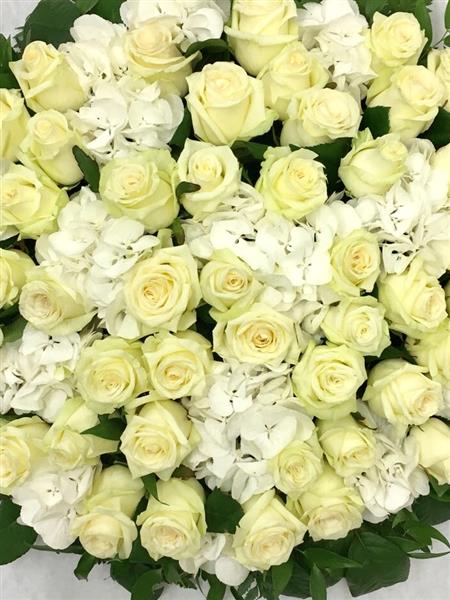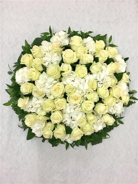 A simple but stunning posy pad of just White Roses and White Hydrangea.