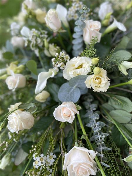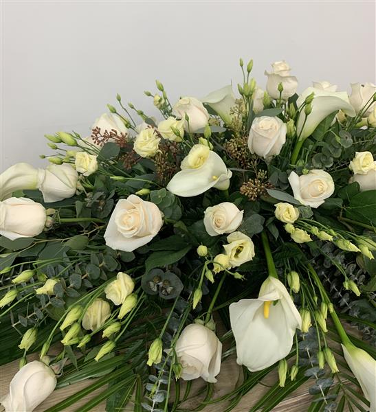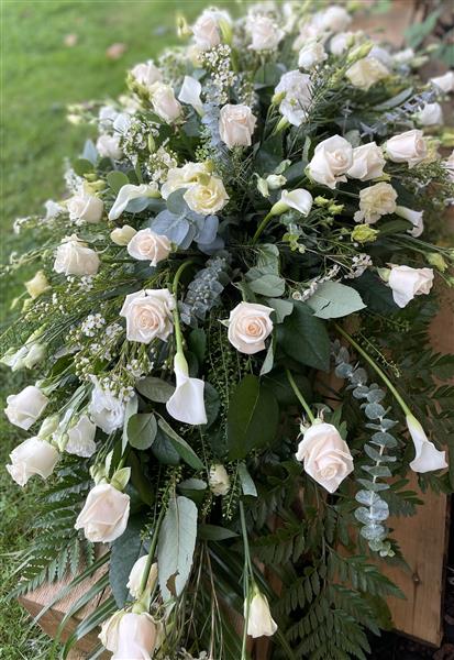 An elegant white and cream select coffin spray consisting of Cream Roses white Lilies and other white and green flowers to complement. finished off with silver eucalyptus.