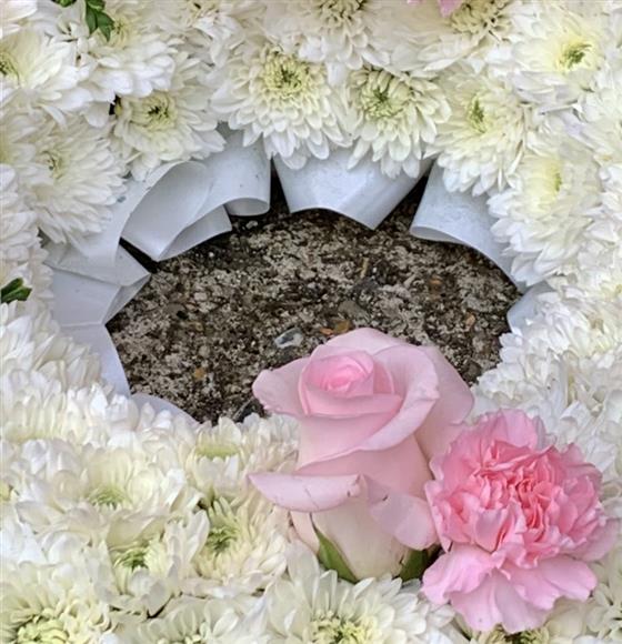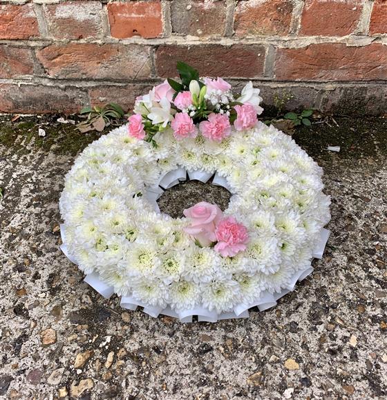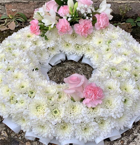 A classic white Chrysanthemum based wreath with a pink rose spray.