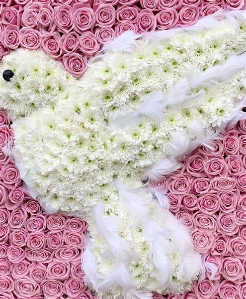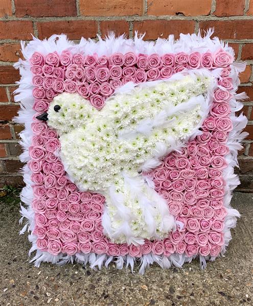This amazing tribute is a brilliant white dove to resemble peace surrounded by heaven pink roses this is a truly special tribute.