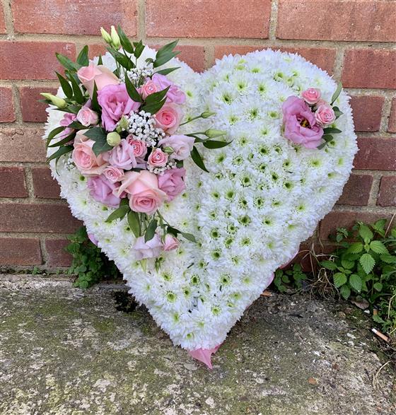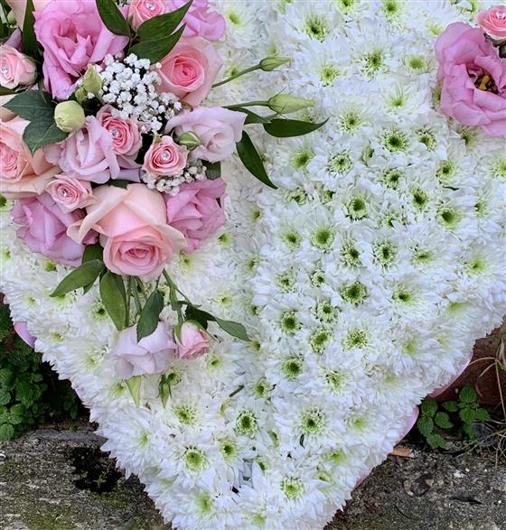 This is based heart shaped oasis, with Pink ribbon, white Double Chrysanthemums and a Spray of pink Roses on top. Available in 4 sizes.
