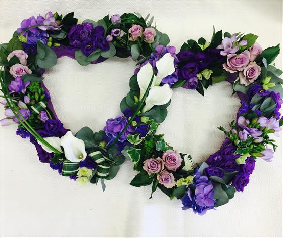 A stunning open heart with white purple and lilac flowers blended together beautifully.