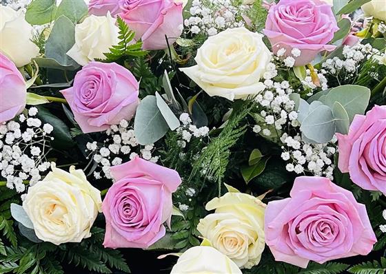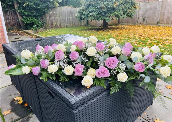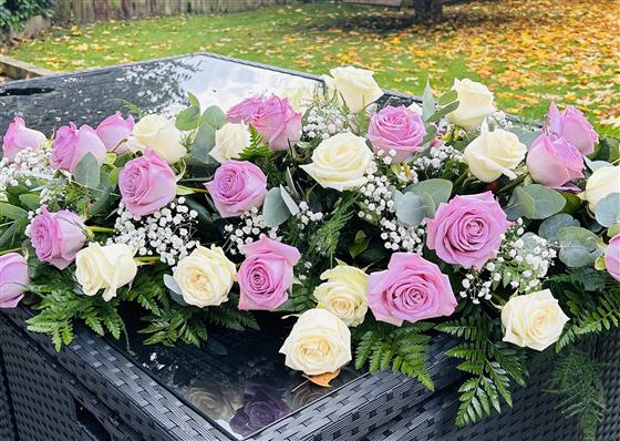 A stunning White and lilac rose casket spray.