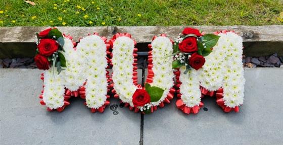 The word Mum with red ribbon and Red Rose sprays with diamanté pins in just for that extra special touch.