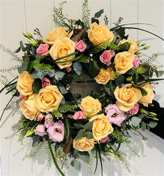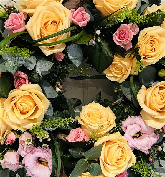 A really special wreath of the most beautiful peach and the softest pink roses in a bed of lovely greens and a touch of white freesia.