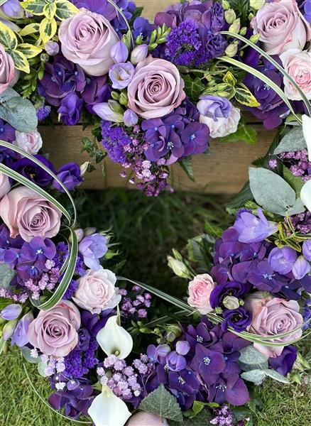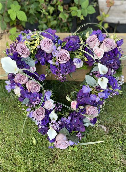 A stunning heart with lilac roses, purple lisianthus, purple hydrangea etc and lime greens to compliment.