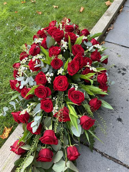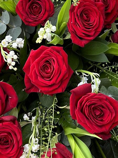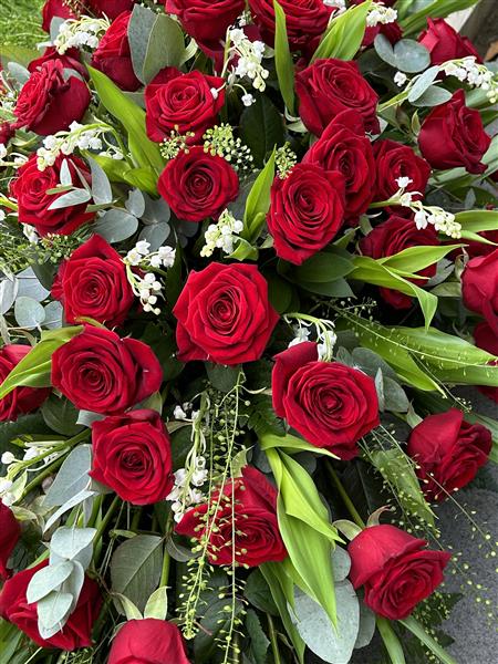 A beautiful dark red rose casket spray with the stunning lily of the valley.