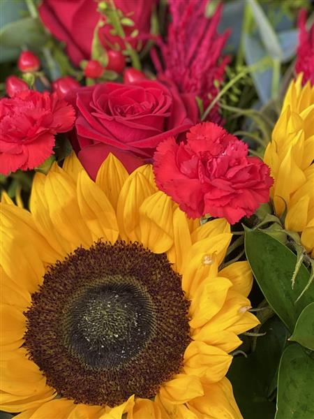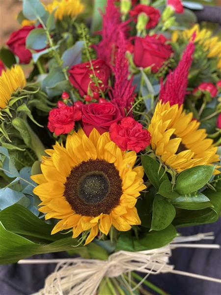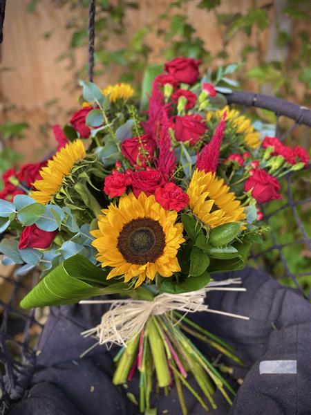 A stunning Sunflowers and Red rose sheaf with other red flowers to complement.