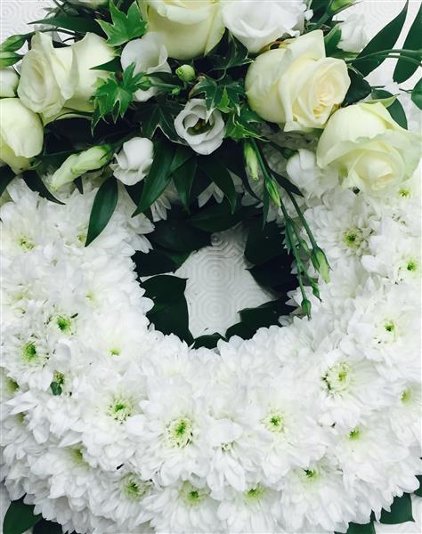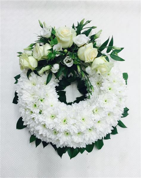 A based pure White Wreath With stunning White Roses finished with Dark greens.