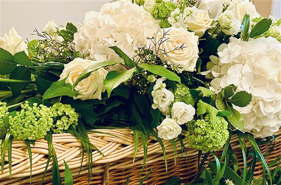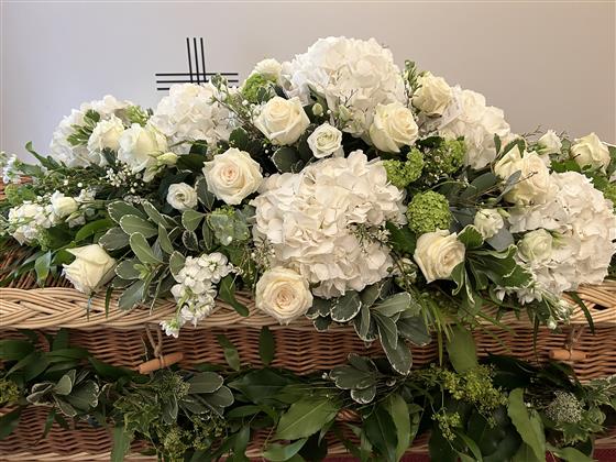 A luxurious casket spray that consist of brilliant white hydrangeas and large headed white roses with luscious greens and wax flower