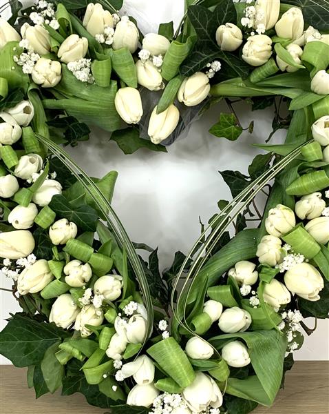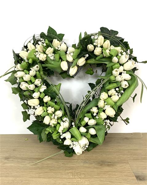 17” open heart made with white tulip folded tulip leaves edged with ivy leaves finished with a touch of Gyp and China grass.