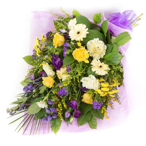 A traditional sheaf of yellows, whites and purples including roses, lisianthus, mini gerberas and solidaster.