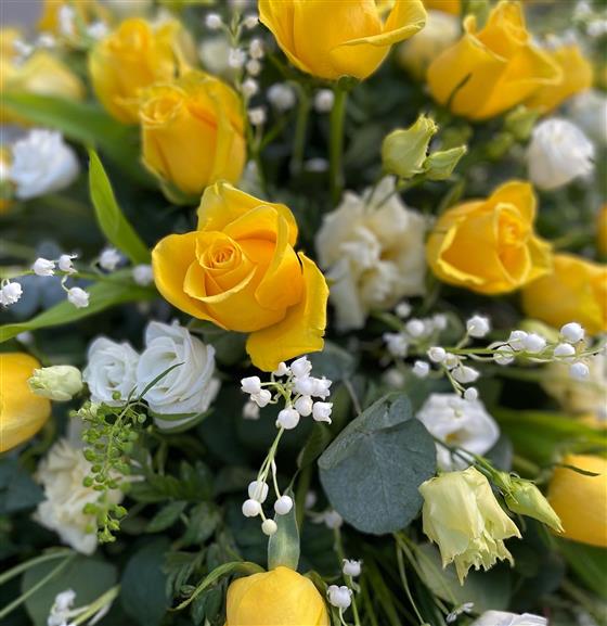 A winning combination of Yellow Roses, lily of the valley white and cream lisianthus.