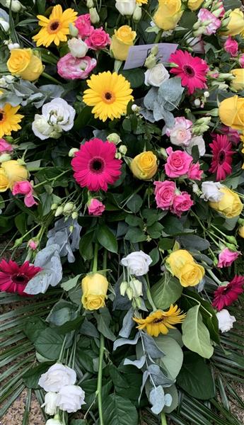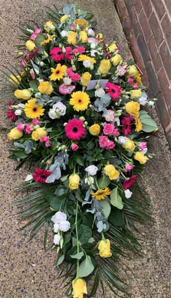 A lovely coffin tribute in Bright Yellows, hot Pinks and brilliant Whites.