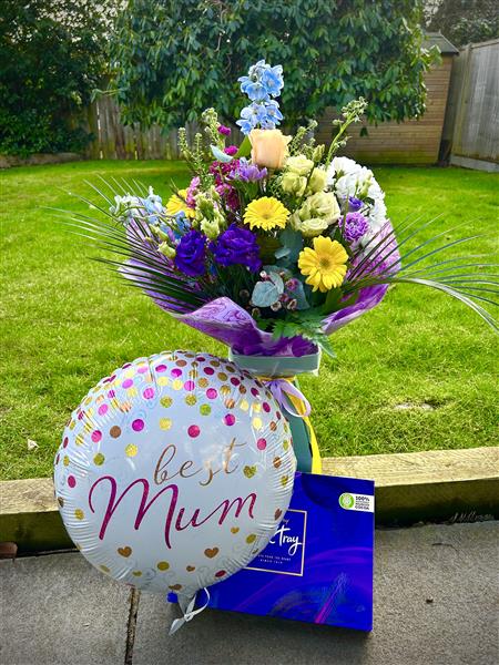 A stunning selection of fresh flowers with a box of milk tray chocolates and a Happy Mother’s Day balloon (balloons may differ)