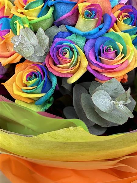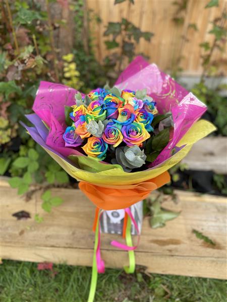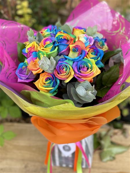 20 rainbow roses wrapped in rainbow wrapping and ribbons