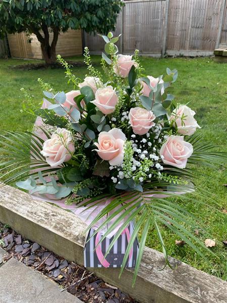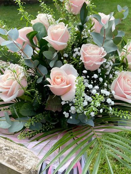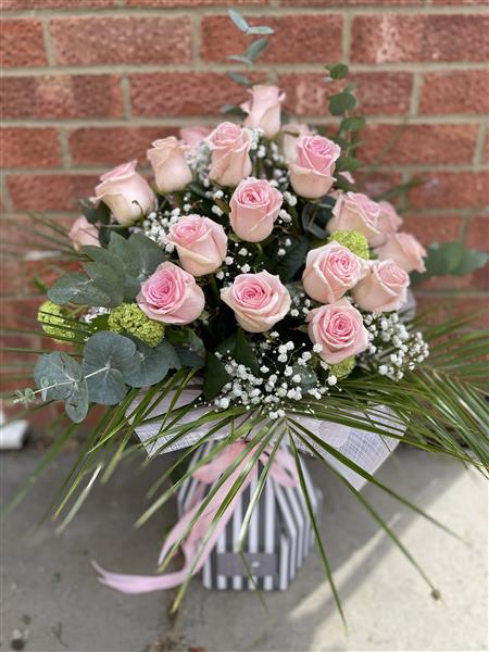 A dozen Pale Light Pink Roses Either sweet Avalanche or Sweet Dolomiti will be used with gyp and Eucalyptus presented in one of our stylish box vases
