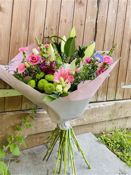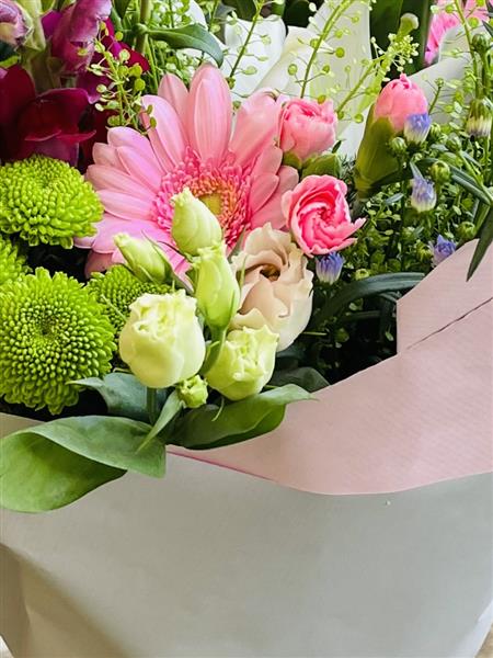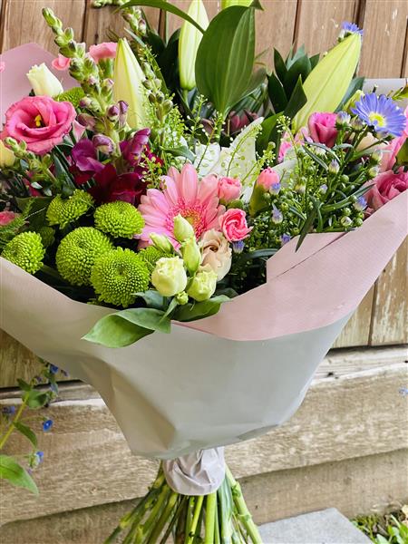 A pretty selection consisting of Best pink roses, cerise Gemini, pink lily, white lisianthus, pink Veronica, pink carnations and pink spray carnations finished of with a lovely selection of greenery.