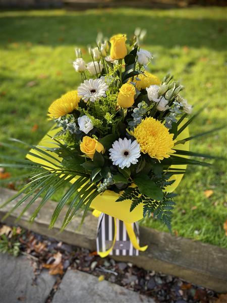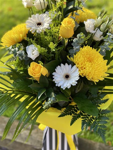This fabulous bouquet has bright yellow chrysanthemum and yellow roses with the fresh whites gerbera and Lisianthus.