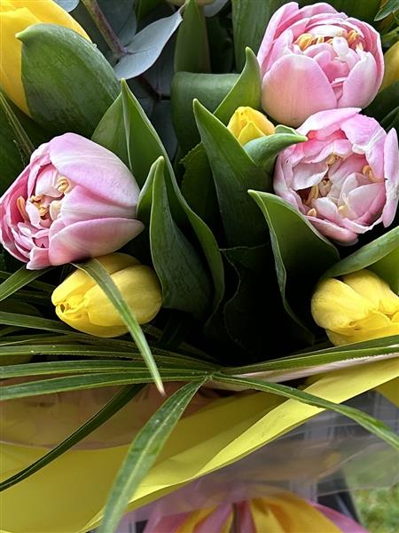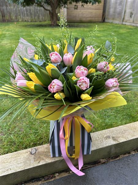 A stunning selection of Yellow and Pink Tulips bind together with Thalyaspia.