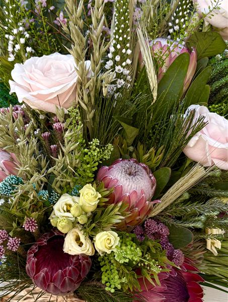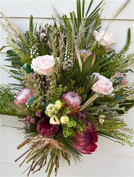 This combination of King Proteas and pale pink roses creates a striking, textured aesthetic that balances the rugged South African wild with soft, romantic elegance. A tied sheaf typically uses long-stemmed elements like wheat and South African grasses (such as Pennisetum or Fountain Grass) to create a natural, flat-backed arrangement, often finished with a simple raffia bow for a rustic look.