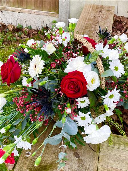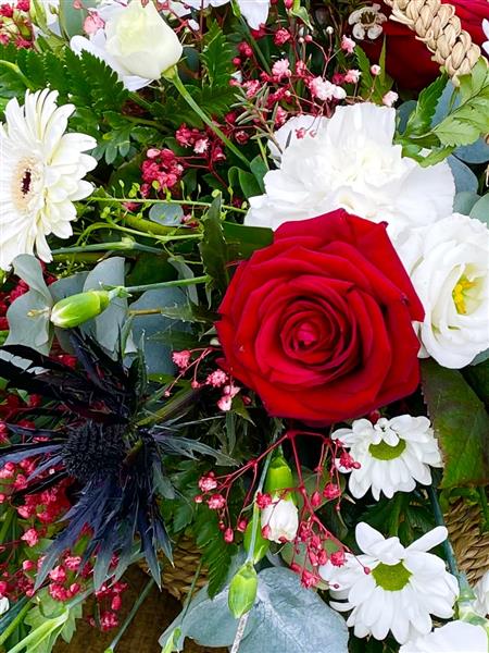 A lovely florist choice of Red and White flowers all arranged beautifully in a Basket.