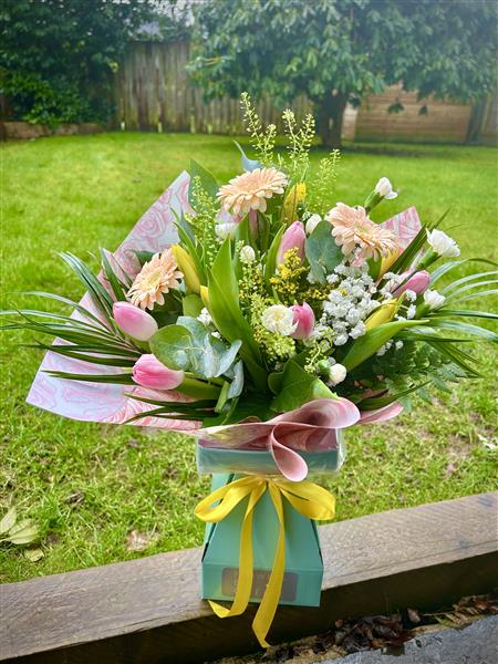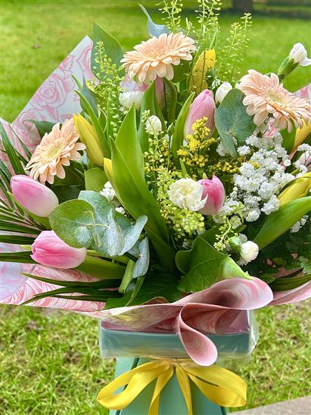 A florist Choice Bouquet with Tulip and other flowers to compliment.