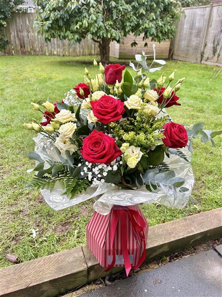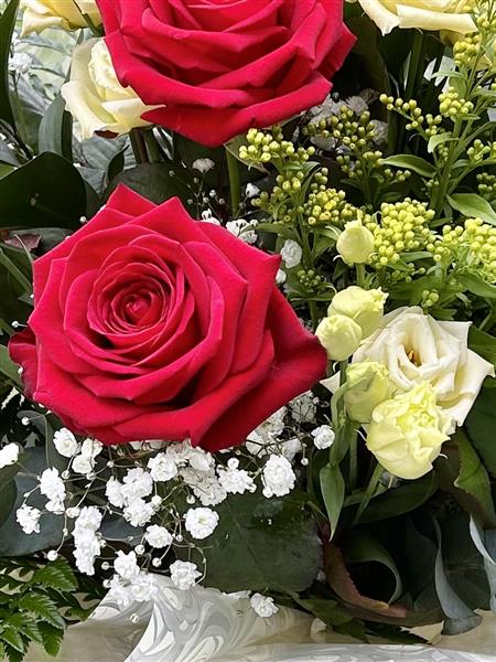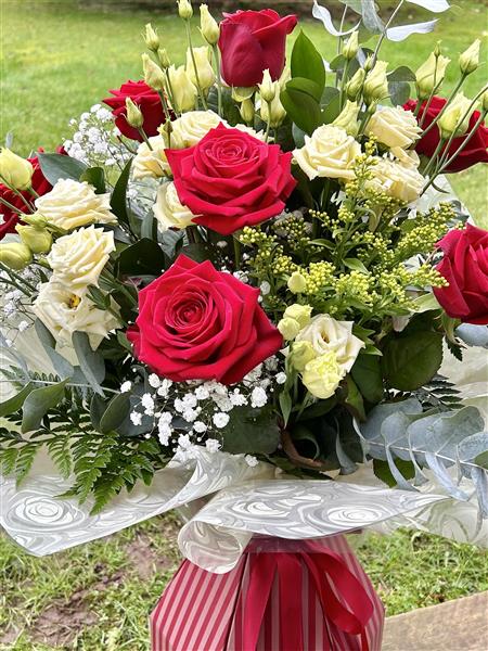 A stunning bouquet that consist of red long stem velvet red roses, cream Lisianthus, gypsophila, and lush greens.