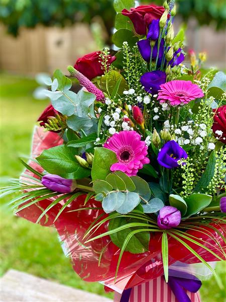 A romantic mixture of Best Red Grandprix Rose, Tulips, scented Freesia, Gypsophila and Pink Veronica finished of with greenery and matching cellophane and a rafia bow.