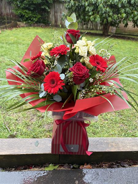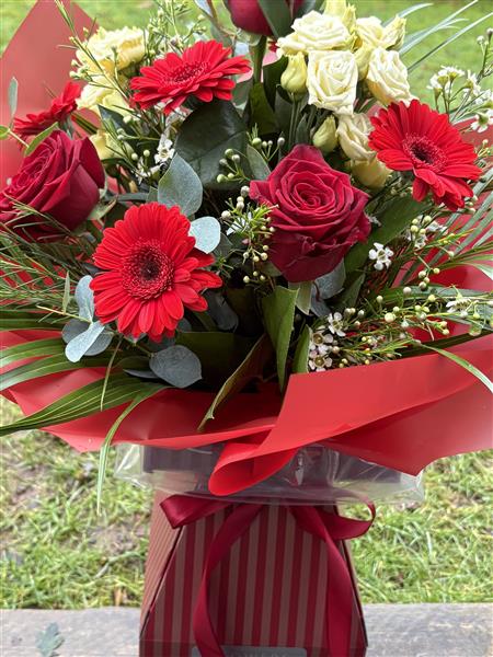 A compact romantic selection of best red roses,red Gerbera with creams lisianthus, Wax, thalyspia and lush greens.